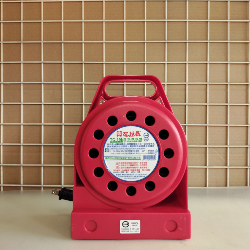 台灣製造,東乾牌輪座型延長線TC-19N系列產品,採用厚實的高純度銅線加上雙層塑膠的2.0mm軟質電纜線,耐拉扯抗彎曲,不易破皮,粗壯的插頭強韌不易折斷,刃片根部設計絕緣包覆,避免因累積污漬造成短路,獨家專利滾軸收放自如不易打結,品質優異,堅固耐用,具備過載、過熱雙重保護開關,安全有保障,通過經濟部標檢局R63376認證,適合臨時施工或會展活動等場合使用,底部附收納盒,長度20台尺、30台尺及40台尺。