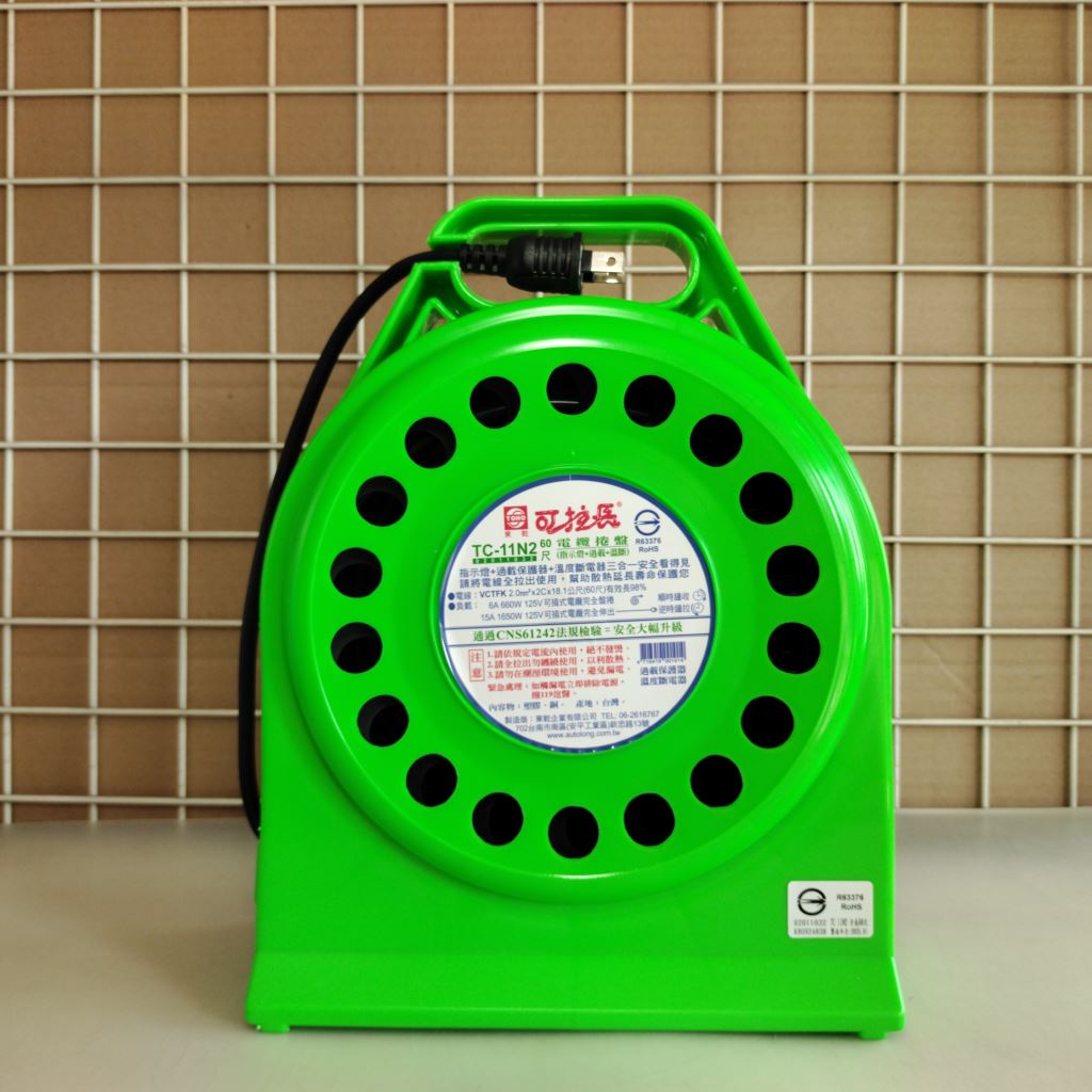 台灣製造,東乾牌輪座型延長線TC-11N系列產品,採用厚實的高純度銅線加上雙層塑膠的2.0mm軟質電纜線,耐拉扯抗彎曲,不易破皮,粗壯的插頭強韌不易折斷,刃片根部設計絕緣包覆,避免因累積污漬造成短路,獨家專利滾軸收放自如不易打結,品質優異,堅固耐用,具備過載、過熱雙重保護開關,安全有保障,通過經濟部標檢局R63376認證,適合臨時施工或會展活動等場合使用,長度50台尺、60台尺、70台尺及80台尺。
