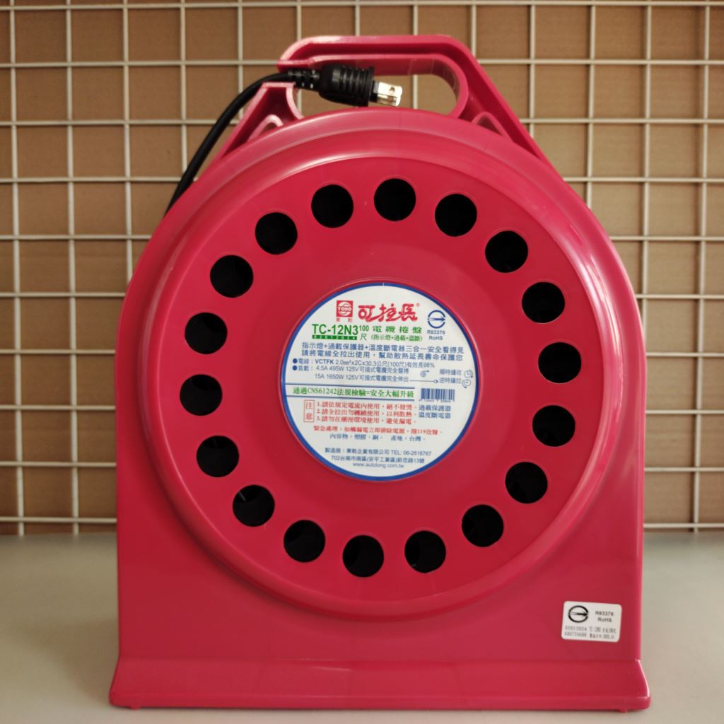 台灣製造,東乾牌輪座型延長線TC-12N系列產品,採用厚實的高純度銅線加上雙層塑膠的2mm軟質電纜線,耐拉扯抗彎曲,不易破皮,粗壯的插頭強韌不易折斷,刃片根部設計絕緣包覆,避免因累積污漬造成短路,獨家專利滾軸收放自如不易打結,品質優異,堅固耐用,具備過載、過熱雙重保護開關,安全有保障,通過經濟部標準檢驗局R63376認證,適合臨時施工或會展活動等場合使用,長度100台尺、120台尺及150台尺。