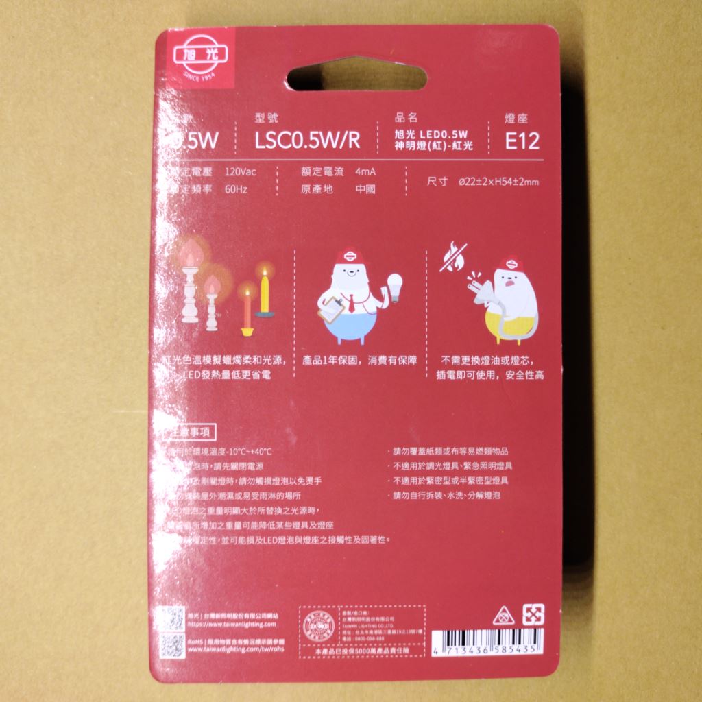 旭光LED燈泡超級省電,發光效率高,用電量只有0.5W而已,遠遠優於2W的傳統鎢絲燈泡,長條型晶片設計,超大發光範圍,亮度平均無暗角,適合燈罩造型多元的裝飾性燈具,電壓110V,適用E12燈座,囿於超商的包裹體積規定,超商取貨最多每單20組(2入組包裝,1包2顆)。顏色紅光,產地中國(China, P.R.C.)