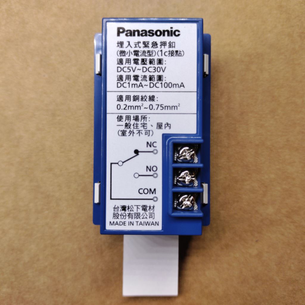 台灣製造!Panasonic開關系列緊急押扣開關,鎖螺絲接點設計,適用0.75mm以下的實心電線或絞合電線,按下之後維持電源導通,拆開上蓋即可關閉,適用DC30V以下的微小電流回路,可搭配Panasonic68系列、文山51/52系列、中一64/68/E64/N64系列、台昱70/80/82系列及樹榮58系列的3孔或6孔蓋片,顏色灰色,型號WNF4510H