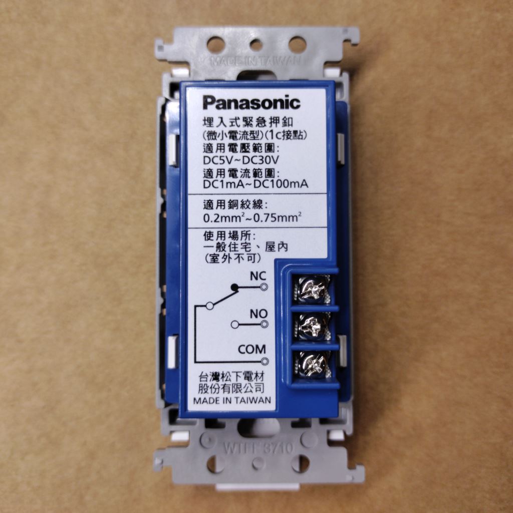 台灣製造!Panasonic開關系列緊急押扣開關,鎖螺絲接點設計,適用0.75mm以下的實心電線或絞合電線,按下之後維持電源導通,拆開上蓋即可關閉,適用DC30V以下的微小電流回路。型號WTDF4510W